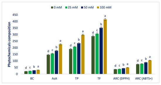 Sodium chloride concentrations gradually increased Folin–Ciocalteu reducing capacity, BC, AsA, TF, and ARC in the following order: Control < 25 < 50 < 100 mM salt concentrations. BC, AsA, Folin–Ciocalteu reducing capacity, TF, and ARC (DPPH and ABTS+) under 25, 50, and 100 mM salt concentration conditions were progressively increased by 14%, 6%, 10%, 6%, 6%, and 5%; 37, 21%, 23%, 22%, 20%, and 19%; and 52%, 55%, 57%, 41%, 38%, and 40%, respectively, compared to control conditions (Figure 8).
