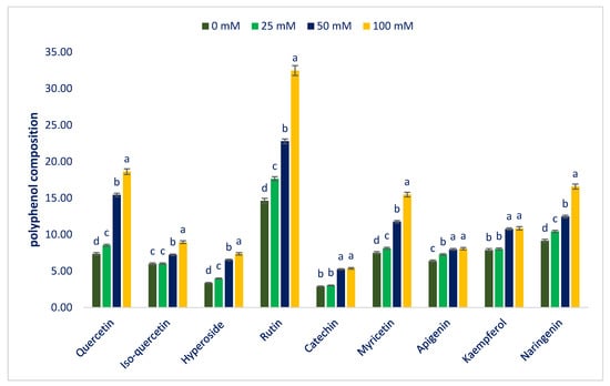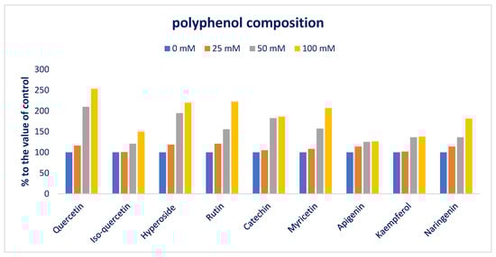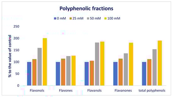 Flavonols, flavanones, and total polyphenols were progressively augmented in the order: Control < 25 < 50 < 100 mM salt concentrations, while flavones and flavanols were progressively augmented in the order: Control = 25 < 50 = 100 mM salt concentrations (Figure 11). In 25, 50, and 100 mM salt concentration conditions, flavonols, flavones, flavanols, flavanones, and total polyphenols were predominately augmented by 12%, 60%, and 101%; 14%, 25%, and 27%; 5%, 82%, and 86%; 14%, 36%, and 81%; and 12%, 5%, and 90%, respectively, compared to control conditions (Figure 12).