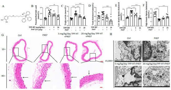 TPP-HT prevents P407-induced serum lipid profile abnormalities and endothelial and mitochondrial injury in the thoracic aorta. (A) Chemical structure of TPP-HT. (B–F) Nonesterified fatty acids, triglycerides, total cholesterol, low-density lipoprotein cholesterol and high-density lipoprotein cholesterol. (G) H&E staining of microstructural changes in the thoracic aorta. The arrow indicates thoracic aortic endothelial cells, scale bar = 100 μm (upper) and 20 μm (lower). (H) Ultrastructural changes in the thoracic aorta; asterisk indicates swelling mitochondria, scale bar = 1 μm. Control group (n = 8), hyperlipidemia group (n = 8), low-dose TPP-HT group (n = 8), high-dose TPP-HT group (n = 8). Values are the mean ± SEM. ** p < 0.01, *** p < 0.001.