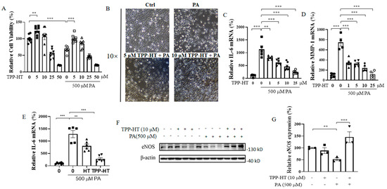 TPP-HT prevents PA-induced cellular lipotoxicity, increases inflammation and decreases eNOS expression in HAECs. HAECs were pretreated with TPP-HT (1, 5, 10, 25, 50 μM), TPP-HT (10 μM) or HT (10 μM) for 24 h, followed by PA (500 μM) challenge for another 24 h. (A) Cell viability. (B) Bright-field microscope image of cells. (C) mRNA level of IL-6. (D) mRNA level of MMP-1. (E) mRNA level of IL-6. (F) Protein levels of eNOS. (G) Arbitrary unit for protein levels of eNOS. Values are the mean ± SEM from at least three independent experiments. ** p < 0.01, *** p < 0.001.