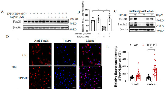 Marked augmentation of ATP production and mitochondrial oxidative respiration by TPP-HT was discovered in our in vitro studies. Moreover, emerging evidence documents FoxO1 as a crucial transcription factor that regulates genes controlling several cellular functions, including mitochondrial function and ATP production [29]. We thereby examined whether FoxO1 was regulated in our model. FoxO1 expression in the presence or absence of TPP-HT was detected, but there were no significant alterations. PA drastically disrupted FoxO1 expression, while the PA-induced disruption was rescued by TPP-HT pretreatment, suggesting that FoxO1 may be involved in TPP-HT cytoprotection (Figure 4A,B). Hence, we further investigated the nuclear translocation of FoxO1. Interestingly, we found that TPP-HT treatment promoted the nuclear translocation of FoxO1, as shown by both subcellular fractionation and immunofluorescence imaging (Figure 4C–E).