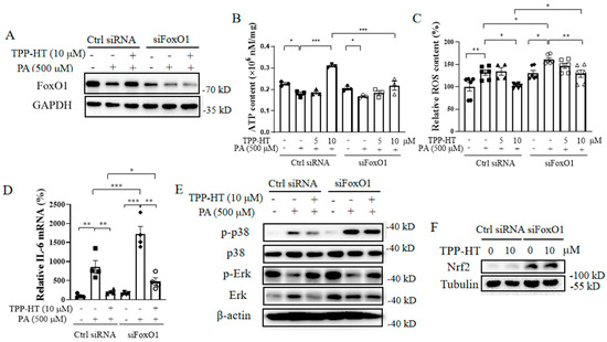 As shown in the above results, TPP-HT exhibited several protective effects, including inflammation, oxidative stress and energetic dysregulation. To explore whether the cytoprotection of TPP-HT was mainly mediated by the FoxO1 regulator, siRNA sequences were used to knockdown FoxO1 in HAECs. As expected, the upregulated expression of FoxO1 by TPP-HT was abolished by FoxO1-targeting siRNA (Figure 5A). Moreover, 10 μM TPP-HT failed to promote ATP production in HAECs under FoxO1 knockdown conditions (Figure 5B), but siFoxO1 had no influence on the TPP-HT-induced decrease in ROS and IL-6 mRNA levels (Figure 5C,D). Intriguingly, knockdown of FoxO1 exacerbated PA-stimulated ROS release and IL-6 production (Figure 5C,D). These results suggest that TPP-HT-potentiated ATP production is mediated mainly by the activation of the FoxO1 signaling pathway, while the decrease in ROS production by TPP-HT in the current study may involve other signaling pathways. Moreover, FoxO1 knockdown aggravated IL-6 production in all probability by increasing p38 activation. In accordance with the above results, siFoxO1 sharpened p38 activation, suggesting that the exacerbation of PA-induced IL-6 release by siFoxO1 is probably mediated by further activating the p38 pathway (Figure 5E). However, Erk has been reported to be an upstream regulator that directly regulates FoxO1 phosphorylation. The p-Erk/Erk ratio was decreased under siFoxO1 conditions. The transcription factor Nrf2 acts as a pivotal regulator of the cellular antioxidant response [30], while FoxO1 knockdown drastically elevated Nrf2 expression (Figure 5F), indicating that Nrf2 may stimulate the antioxidant network to scavenge excessive ROS production resulting from FoxO1 knockdown.