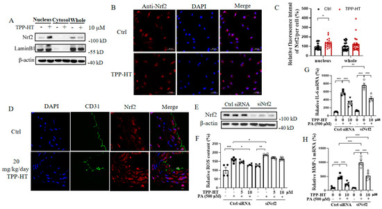 As a master regulator of cellular resistance to oxidative stress, Nrf2 was further considered involved in the antioxidant effects of TPP-HT. The results indicated that TPP-HT had no influence on Nrf2 expression but significantly promoted Nrf2 nuclear translocation (Figure 6A–C), which further induced the expression of an array of antioxidant response element-dependent genes to regulate antioxidant defense [31]. Accordingly, our in vivo findings showed that 20 mg/kg/day TPP-HT for 9 days also promoted Nrf2 nuclear translocation in endothelial cells of the thoracic aorta, suggesting that Nrf2 was a crucial regulator in the presence of TPP-HT (Figure 6D). Moreover, we detected the mRNA levels of Nrf2′s target gene GSTM (glutathione S-transferase mu) by Realtime-q-PCR, and found that TPP-HT could significantly increase mRNA level of GSTM in a dose-dependent manner (Figure S1). Therefore, the knockdown of Nrf2 expression by siRNA was used to elucidate whether it could impede the ability of TPP-HT pretreatment to inhibit the PA-induced ROS burst. As expected, siNrf2 exacerbated the PA-induced inflammatory response; moreover, the inhibition of excessive ROS production by TPP-HT was completely blocked by siNrf2 (Figure 6E,F). However, Nrf2 knockdown did not weaken the anti-inflammatory effects of TPP-HT but aggravated PA-induced IL-6 and MMP-1 production, indicating that the anti-inflammatory effects of TPP-HT in the present study might be regulated via other signaling pathways (Figure 6G,H).