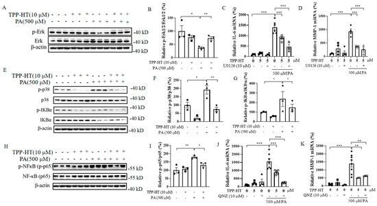 TPP-HT pretreatment abrogates PA-induced IL-6 and MMP-1 mRNA production by inhibiting the p38/NF-кB signaling pathway in HAECs. HAECs were treated with TPP-HT at 10 μM for 24 h, followed by 500 μM PA challenge for 24 h. HAECs were treated with TPP-HT (10 μM) for 24 h in the absence or presence of Erk inhibitor U0126 (10 μM) or NF-кB inhibitor QNZ (10 μM) pretreatment, followed by PA (500 μM) challenge for another 24 h. (A) Protein levels of p-Erk, Erk. (B) Arbitrary unit for protein levels of p-Erk, Erk. (C) mRNA level of IL-6. (D) mRNA level of MMP-1. (E) Protein levels of p-p38, p38, p-IKBα and IKBα. (F) Arbitrary unit for protein levels of p-p38, p38. (G) Arbitrary unit for protein levels of p-IKBα and IKBα. (H) Protein levels of p-NF-κB and NF-κB. (I) Arbitrary unit for protein levels of p-NF-κB and NF-κB. (J) mRNA level of IL-6. (K) mRNA level of MMP-1. * p < 0.05, ** p < 0.01, *** p < 0.001.