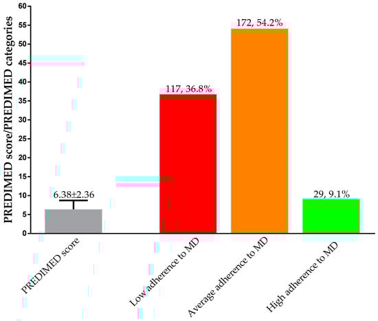 Before the start of the VLCKD, the PREDIMED score was 6.38 ± 2.36. Most of the women (172, 54.2%) had average adherence to the MD, followed by low (117, 36.8%) and high adherences to the MD (29, 9.1%); Figure 1.