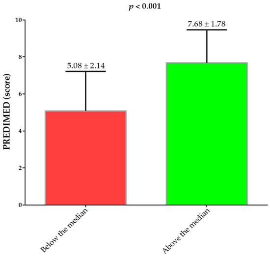Figure 2 shows the PREDIMED scores above and below the median of the Δ% FM kg (−14.84%). The women that were above the median of the Δ% FM kg had the highest PREDIMED score than the women that were below the median of the Δ% FM kg (p < 0.001).