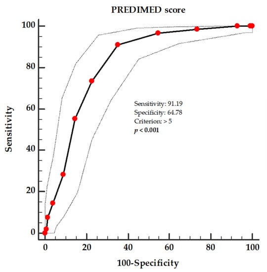 A ROC analysis was performed to determine the cut-off value of the PREDIMED score, which was predictive of the greatest FM loss at the end of the active phase of the VLCKD (above the median value of the Δ% FM kg, −14.84%), as shown in Figure 3. A value of the PREDIMED score of >5 (p < 0.001; AUC 0.825; standard error 0.024; 95% IC 0.778 to 0.872) could serve as a threshold for identifying patients who are most likely to lose FM at the end of the active phase of the VLCKD.