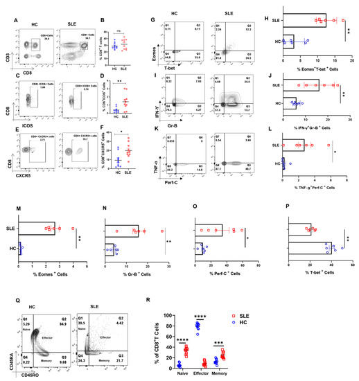 Our primary objective was to examine for altered CD8+ T cell populations between healthy volunteers and SLE patients and to report significant differences between them (Figure 1A,B). When we analyzed for the expression of ICOS, a known co-stimulator of CD8+ T cells, we found its expression to be significantly higher in SLE patients, strongly indicating their higher activation (Figure 1C,D). Additionally, SLE CD8+ T cell expressed higher CXCR5, a chemokine receptor for CXCL13 known to be functionally responsible for B cell maturation (Figure 1E,F). The elevated CXCR5 expression in SLE CD8+ T cells suggested their resemblance to Tfh cells and is also functionally evinced in the disease wherein multi-organ auto-antibodies are encountered apart from severe inflammation. Altogether, the augmented expression of ICOS and CXCR5 on CD8+ T cells of SLE suggested a pathogenic CD8+ T cell population displaying exaggerated cytotoxicity and indirectly capable of inducing higher antibody response via B cell activation.