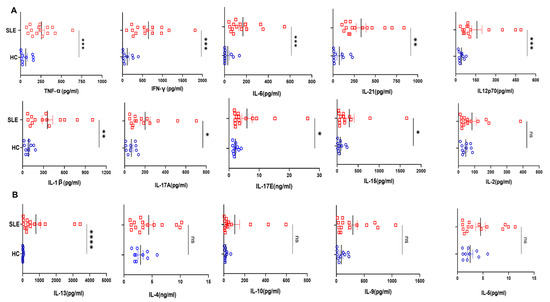 Cytokines analyses in SLE patients and healthy controls. Representative figures from 20 T cell cytokines analyzed in SLE patients’ plasma (n = 15) and healthy controls (n = 10) are represented as plunge plots. Inflammatory cytokines including IFN−γ, IL−12p40, TNF−α, IL−6, IL−1β, IL−17A, IL−17E, IL−21, IL−15 and IL−21 were significantly elevated in SLE patients as compared to HC (A). Among anti-inflammatory cytokines, only IL−13 was elevated in SLE patients, while all others, including IL−10, IL−4, IL−5 and IL−9, did not show any difference between the two groups (B). Error bar indicates SEM. Mann–Whitney U Test was performed to compare between the two groups; p < 0.05 was considered statistically significant (*); p < 0.01 was considered to be very significant (**); p < 0.001 was considered to be highly significant (***); p < 0.0001 was considered extremely significant (****), and ns means non-significant.