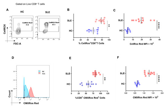 Cellular ROS (cROS) and mitochondrial hyperpolarization in SLE CD8+ T cells. CD8+ T cells from SLE displayed higher cellular ROS than healthy controls. Representative flow cytometry plots showing CD8+ T cells from HC (n = 10) and SLE (n = 10) (A) stained with CellROX Red to determine cellular ROS in CD8+ T cells and cumulative graphical representation of the % cells expressing CellROX (B). Graphical representation showing difference in the median fluorescence intensity (MFI) of CellROX between HC and SLE (C). Representative flow cytometry plots showing CD8+ T cells from HC (n = 10) and SLE (n = 10) stained with CMXROS Red to determine mitochondrial hyperpolarization (D). Cumulative graphical representation of the % cells expressing CMXROS Red (E) and graphical representation showing difference in the median fluorescence intensity (MFI) of CMXROS Red between HC and SLE (F). Error bar indicates SEM. Mann–Whitney U test has been used to compare the groups. p < 0.01 was considered to be very significant (**); p < 0.0001 was considered extremely significant (****).