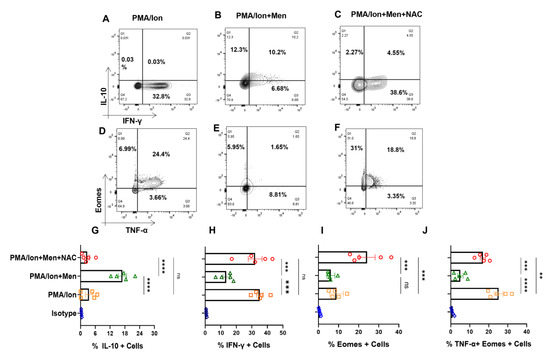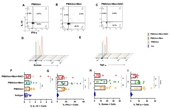 In order to confirm that the SLE CD8+ T cell response was indeed characteristic of an inflammatory cytotoxic T cell, that modulating ROS was indeed capable of regulating the inflammatory/anti-inflammatory response, and that the above results were not artifacts, we treated ex vivo differentiated human Tc1 cells to oxidant/antioxidant reagents. Differentiated Tc1 cells displayed significant IFN-γ production and extremely low IL-10 expression with PMA/Ion activation and reversed the trend with menadione treatment (Figure 6A,B). Not surprisingly, the expression of IFN-γ was restored upon treatment with antioxidant NAC (Figure 6C). Most importantly, our results were similar among the tested batches of terminally differentiated Tc1 cells (Figure 6G–H), wherein the addition of exogenous ROS to Tc1 cells drives an anti-inflammatory response and it was reversed with the addition of an antioxidant. Additionally, Eomesdermin (Eomes), as one of the crucial transcription factors, and TNF-α, as one of the crucial pleiotropic cytokines, which are both required to sustain the cytotoxic and inflammatory response of CD8+ T cells, were also examined. When we tested for these proteins in terminally differentiated Tc1 cells with PMA/Ion, we observed the significant expression of Eomes+, TNF-α+ and double-positive populations (Figure 6D). On menadione treatment, the percentages of both Eomes-positive and dual-positive Eomes and TNF-α population decreased (Figure 6E), suggesting their oxidant sensitivity and on adding NAC dual positivity of Eomes and TNF-α population was again restored indicating NAC can convert these cells to an inflammatory phenotype (Figure 6F). The above results confirmed that both terminally differentiated Tc1 cells, as well as SLE CD8+ T cells, were redox-sensitive but were contraindicated in the latter due to the highly inflammatory disease conditions.