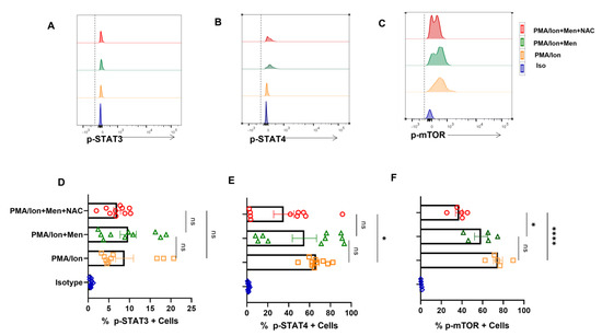 ROS is known to upregulate p-STAT3, which consequently led us to examine for the levels of p-STATs, including p-STAT4 in SLE CD8+ T cells. We report no significant change in p-STAT3 levels from SLE CD8+ T cells (Figure 5A,D) but showed that NAC was able to downregulate activated p-STAT4 levels in SLE CD8+ T cells (Figure 5B,E). Our studies indicated that hyper-cytotoxic/polarized SLE CD8+ T cells display p-STAT3 that was insensitive to any oxidant/antioxidant treatment, while p-STAT4 was antioxidant-sensitive. Further, this selective sensitivity could be a result of the inflammatory cytokine environs that SLE CD8+ T cells exist in or encounter during activation. Crucially, p-STAT3′s insensitivity could be due to the complete uncoupling or desensitization of the IL-10 pathway, and the subsequent inability to modulate IL-10 secretion could be due to the persistent inflammatory environment (Figure 4A,F). On the other hand, the modulation of p-STAT4′s activity with NAC again points to an inflammatory cytokine signaling pathway still responsive to antioxidants. Since mitochondrial hyperpolarization activates mammalian target of rapamycin (mTOR), which can modulate T cell differentiation and cell-death pathways, we analyzed for their oxidant/antioxidant sensitivity in SLE CD8+ T cells. p-mTOR from SLE CD8+ T cells again was significantly NAC-sensitive (Figure 5C,F) consolidating our earlier conclusion and maybe suggesting upstream presence to p-STAT3 and 4. These results also suggested that p-mTOR could be modulated in SLE CD8+ T cells to counter their inflammatory potential. However, p-mTOR’s response with menadione or NAC suggests no correlation with IL-10, while IFN-γ and Eomes had a direct co-relationship with NAC.