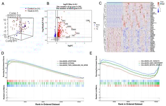 Differential expression analysis was carried out after the selected gene expression matrix was normalized through the “limma” software package of R language []. The eligibility criteria of DEGs were |logFC| > 0.1, adjusted p value < 0.05. The data were visualized by the “ggplot2” package and “pheatmap” package in the R software. In order to investigate the potential mechanism between treatment group and control group of “mh.all.v2022.1.Mm.symbols.gmt”, which was downloaded from the molecular signature database (https://www.gsea-msigdb.org/gsea/index.jsp (accessed on 25 November 2022)) [], the “clusterProfiler” R package [] was used to respectively perform GSEA. The top three significantly enriched pathway gene sets were displayed. Statistical significance was set at a p value < 0.05.