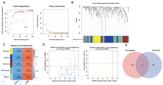 Weighted co-expression network analysis. (A) Assessment of scale-free fit index (left) and mean connectivity (right) for distinct soft threshold powers. (B) Dendrogram of clustering of differentially expressed genes based on topological overlap matrix. (C) Heatmap of the correlation between modules and sample traits. (D) Two scatter plots of gene significance for HIBD vs. module membership in the blue module and yellow module. (E) Venn plot for intersected genes in WGCNA modules and ferroptosis-related genes.