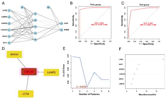 The construction of HIBD classification model and identification of gene biomarkers for HIBD. (A) Visualization of artificial neural network results. (B,C) The ROC curves were utilized to evaluate the performance of the HIBD classification model in training and validation datasets. (D) CytoHubba detected four ferroptosis-HIBD genes. (E) Three genes were identified by the SVM-RFE algorithm with an error of 0.0229. (F) A minimum error regression tree was established for six ferroptosis-HIBD genes.