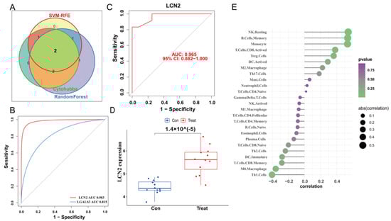 Validation of the diagnostic value of the hub gene. (A) Venn diagram indicates the overlapping genes in SVM-RFE algorithm, random forest algorithm and CytoHubba. (B) The comparison of two potential biomarkers via GSE23333. (C) ROC curves of LCN2 in dataset GSE184997. (D) The expression of LCN2 in the dataset GSE184997. (E) Lollipop plot showing the correlation of immune cell infiltration and LCN2.