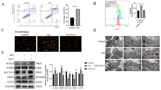 To validate the possibility of bioinformatic screening of LCN2 as a biomarker for the ferroptosis-associated gene HIBD, glutamate-stimulated HT22 cells were used for 24 h. First of all, we examined the changes in HT22 cell viability when exposed to different concentrations of glutamate by the CCK-8 assay. The experimental results showed that glutamate toxicity to HT22 cells increased with increasing time and concentration (Supplementary Figure S5). Moreover, we performed an annexin-V/propidium iodide (AV/PI) dual staining assay followed by flow cytometry. The experimental results showed that a significant increase in the number of dead cells was observed in HT22 cells when exposed to glutamate (Figure 5A). Lipid peroxidation was detected by flow cytometry and was significantly elevated in glutamate-stimulated HT22 cells (Figure 5B). To further determine the presence of ferroptosis in glutamate-stimulated HT22 cells, we examined the mitochondrial structure and Fe2+ content. Notably, glutamate stimulation of HT22 cells significantly altered mitochondrial structure, with a reduction in mitochondrial cristae and an increase in membrane density, as well as an increase in Fe2+ content (Figure 5C,D). Ferro Orange is a fluorescent probe that specifically detects unstable iron (II) ions (Fe2+) and is localized to the endoplasmic reticulum. Consistent with the bioinformatic screening results, LCN2 was highly expressed in the glutamate-stimulated HT22 group (Figure 5E). In addition, the results of Western blotting experiments showed that the expression levels of ACSL4 and 4HNE proteins were increased in glutamate-stimulated HT22 cells, while the expression levels of SLC7A11 and GPX4 proteins were decreased (Figure 5E). This further suggests that glutamate induces ferroptosis in HT22 cells. The use of Fer-1 (a ferroptosis inhibitor; the anti-ferroptotic activity of Fer-1 is actually due to the scavenging of initiating alkoxyl radicals produced, together with other rearrangement products, by ferrous iron from lipid hydroperoxides []) reversed all of these trends (Figure 5A–E). In conclusion, LCN2 plays an important role in the regulation of glutamate-stimulated ferroptosis in HT22 cells.
