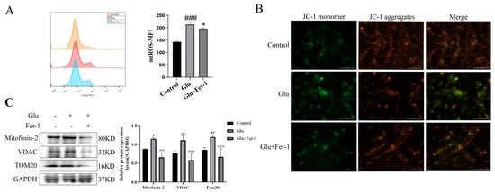 Since HIBD, ferroptosis and ROS production are closely related, and mitochondria are important organelles for ROS production, we hypothesized that LCN2 regulation of glutamate-induced ferroptosis in HT22 cells is associated with mitochondrial dysfunction. We determined the effects of glutamate-stimulated HT22 cells on mtROS and MMP using mtROSTM 580 staining and JC-1 staining, respectively. Flow cytometry results showed that glutamate induction of HT22 cells significantly increased mtROS production (Figure 6A). The effect of glutamate stimulation of HT22 cells on MMP was observed using a multifunctional microplate detection system. When the mitochondrial membrane potential is high, JC-1 aggregates in the mitochondrial matrix (matrix) form polymers (J-aggregates), which can produce red fluorescence; when the mitochondrial membrane potential is low, JC-1 cannot aggregate in the mitochondrial matrix when JC-1 is a monomer, which can produce green fluorescence. The fluorescence of JC-1 aggregates was significantly decreased in glutamate-stimulated HT22 cells compared to controls, indicating a decrease in MMP (Figure 6B). More importantly, the trend of mtROS and MMP could be reversed using Fer-1 (Figure 6A,B). This implies that ferroptosis in our glutamate-stimulated HT22 cells may be mediated by mitochondrial dysfunction. To further clarify the association, the protein expression levels of Mitofusin2, VDAC, and TOM20 were examined by Western blotting assays. Glutamate stimulation of HT22 cells significantly increased the expression levels of Mitofusin2, VDAC and TOM20 compared to the control group, while the addition of Fer-1 down-regulated their expression levels (Figure 6C). This revealed that glutamate stimulation of HT22 cells significantly disrupted the structural integrity of mitochondria and produced dysfunction, which was rescued by the use of Fer-1. All of the above data suggest that glutamate induces mitochondrial dysfunction-mediated ferroptosis in HT22 cells.