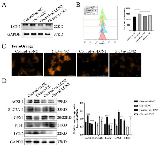 To determine whether LCN2 could protect against neuronal injury after HIBD by inhibiting ferroptosis, we next assessed the effect of LCN2 knockdown on glutamate-stimulated ferroptosis in HT22 cells. First, we examined LCN2 knockdown efficiency by Western blotting assay, which showed a good second knockdown (Figure 7A), so we next chose to use a second si-LCN2 for subsequent experiments. Flow cytometry assays of C11 BODIPY 581/591 fluorescent probe staining showed that LCN2 knockdown significantly inhibited the elevated glutamate-stimulated lipid peroxidation in HT22 (Figure 7B). Importantly, we found by looking at Ferro Orange fluorescent probe staining that LCN2 knockdown significantly reduced Fe2+ content and inhibited iron accumulation compared to glutamate-stimulated HT22 cells (Figure 7C). ACSL4 promotes lipid peroxidation in polyunsaturated fatty acids (PUFAs) []; SLC7A11, GPX4 and FTH1 were consumed at the time of the ferroptosis event []. In addition, the LCN2 knockdown group showed significantly lower levels of the ferroptosis-related gene ACSL4 protein and higher levels of SLC7A11, GPX4 and FTH1 protein expression compared to the glutamate-stimulated HT22 cell group (Figure 7D). These results suggest that LCN2 gene deficiency inhibits the occurrence of neuronal ferroptosis in glutamate-stimulated HT22.