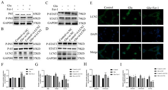 LCN2 regulates the activation of the NF-κB /STAT3 axis in glutamate-stimulated HT22 cells. (A–D,F–I) Western blotting was used to detect the protein expression of P-P65, P65, STAT3, P-STAT3, LCN2 and GAPDH in different treated HT22 cells. Quantitative analysis of results. Compared with the addition of the si-NC empty carrier group, * p < 0.05, *** p < 0.001, **** p < 0.0001. Compared to the group treated with glutamate stimulation combined with si-NC, # p < 0.05, ## p < 0.01, #### p < 0.0001. Two-way ANOVA multiple comparisons were performed between groups. (E) Immunofluorescence images of HT22 cells labeled with P65 antibody. Co-staining with DAPI (blue) to show the nucleus. Scale bar = 100 μm. For all experiments, glutamate: 10 mM, Fer-1: 5 μM.
