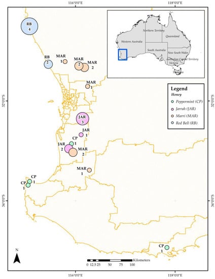 Calothamnus spp. honey (Red Bell, Myrtaceae, n = 8), Agonis flexuosa honey (Coastal Peppermint, Myrtaceae, n = 5), Corymbia calophylla honey (Marri, Myrtaceae, n = 13), and Eucalyptus marginata honey (Jarrah, Myrtaceae, n = 6) were purchased from different suppliers in Western Australia (WA) (see Table S1). Figure 1 shows the geographical locations from where the honeys were collected.