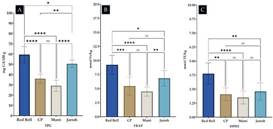 Comparison of the TPC (A), FRAP (B), and DPPH (C) of Calothamnus spp. (Red Bell), Agonis flexuosa (Coastal Peppermint, CP), Corymbia calophylla (Marri), and Eucalyptus marginata (Jarrah) honey. (Tukey post-hoc comparison: ns (not significant) = p > 0.05, * = p < 0.05, ** = p < 0.005, *** = p < 0.0005, **** = p < 0.0001).