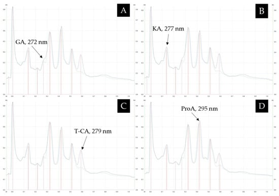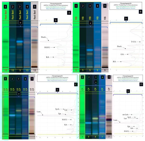 A comparison between the peak profile of each honey and the respective honey over-spotted with a mixture of its identified constituents was also used to further confirm the phenolic compound determination. For confirmation, scans were performed, for example, at each specific λmax of each identified compound in Calothamnus spp. (Red Bell) honey (Figure 7A–D) using databases 2A and 2B and based on this analysis, the Rf of the matched compounds were found to be similar to that of the identified bands in the honey. Moreover, an increase in the absorbance confirmed the presence of the compounds in the honey. Profile comparisons for the other investigated honeys are included in the Supplementary Materials (Figures S5–S11).