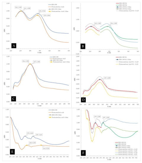Spectra overlay of unknown band at Rf 0.390 in Calothamnus spp. (Red Bell) honey vs. protocatechuic acid (10) using MPB. (A)—UV-Vis spectra and (B)—overlay of the ±0.125 AU comparison prior to derivatisation, (C)—UV-Vis spectra, (D)—overlay of the ±0.125 AU comparison after derivatisation with NP-PEG, (E)—UV-Vis spectra, (F)—overlay of the ±0.125 AU comparison after derivatisation with VSA.