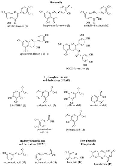 Protocatechuic acid (10) was found to be the most abundant constituent in Calothamnus spp. (Red Bell) honey, followed by epigallocatechin gallate (5), kojic acid (14), gallic acid (8), and t-cinnamic acid (13). In the case of Agonis flexuosa (Coastal Peppermint) honey, epicatechin (4) was found to be the most abundant, followed by kojic acid, epigallocatechin gallate, lumichrome (15), syringic acid (11), luteolin (1), and m-coumaric acid (12). For Corymbia calophylla (Marri) honey, gallic acid was found to be the most abundant compound, followed by epigallocatechin gallate, eudesmic acid (7), epicatechin, luteolin, taxifolin (3), kojic acid, and m-coumaric acid (12). 2,3,4-Trihydroxy benzoic acid (6) was found to be the most abundant compound in Eucalyptus marginata (Jarrah) honey, followed by epicatechin, o-anisic acid (9), taxofolin, lumichrome, m-coumaric acid, kojic acid, and hesperitin (2) (see Figure 5 for structures).