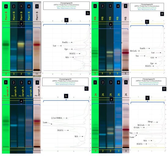 HPTLC Profile of Calothamnus spp. (Red Bell) honey (A,B) and Agonis flexuosa (Coastal Peppermint) honey (C,D) using MPA (A,C), and MPB (B,D). (a) Plate images obtained under the following light conditions: 254 nm prior to derivatisation (1), 366 nm prior to derivatisation (2), 366 nm after derivatisation with NP-PEG (3), 366 nm after derivatisation with VSA (4), transmittance in white light after derivatisation with VSA (5); (b) Chromatograms prior to derivatisation obtained at 254 nm and 366 nm.