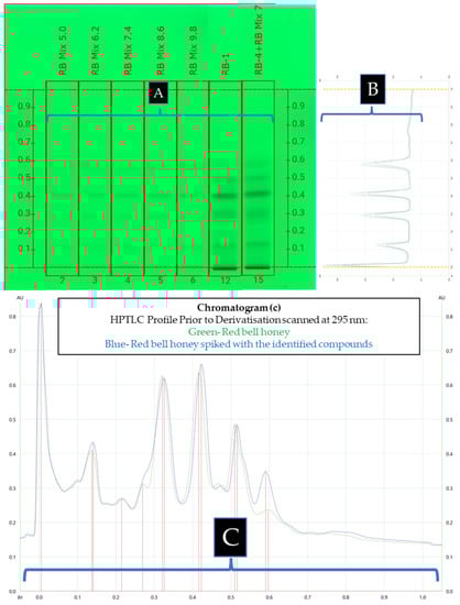 (A) HPTLC Images of the compound mixture of identified compounds in Calothamnus spp. (Red Bell) honey using various application volumes (Tracks 2–6) as compared to Red Bell honey (Track 12), and Red Bell honey spiked with the mixture of identified compounds (Track 15); (B) peak profile of compounds identified in Calothamnus spp. (Red Bell) honey; (C) peak profile of Red Bell honey (green), and Red Bell honey spiked with the identified compound mixture (blue) scanned at 295 nm using MPB.