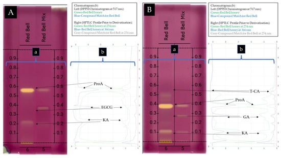 The DPPH antioxidant activity of the four pooled and extracted Western Australian honeys along with the phenolic compounds that were previously identified in each honey were analysed in the HPTLC-DPPH assay using two solvent systems (MPA and MPB). Figure 8 shows the DPPH-HPTLC plate of Red Bell honey. The images of the other honeys are shown in Figures S13–S15.