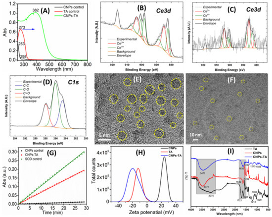 Figure 2. Shows various materials characterization techniques subjected to tannic acid (TA) molecules conjugated with cerium oxide nanoparticles (CNPs) by the bioconjugation process at room temperature. (A) UV−Vis spectrum of control CNPs (peaks at 253 and 298 nm), TA (peak at 273 nm), and CNPs−TA (peak at 382 nm). (BD) X−ray photoelectron spectroscopy (XPS) spectrum of control CNPs, TA, and CNPs−TA. (E,F) High-resolution transmission electron microscopy (HR−TEM) images of control CNPs and CNPs−TA. (G) Superoxide dismutase (SOD) activity of CNPs−TA compared with control SOD and CNPs. (H) The zeta potential of pure and conjugated samples. The zeta potential of control CNPs showed 23 ± 2 mV, which changed to −19 ± 2 mV after conjugation of the TA molecule. (I) FTIR spectrum of TA, CNPs and CNP-TA samples.