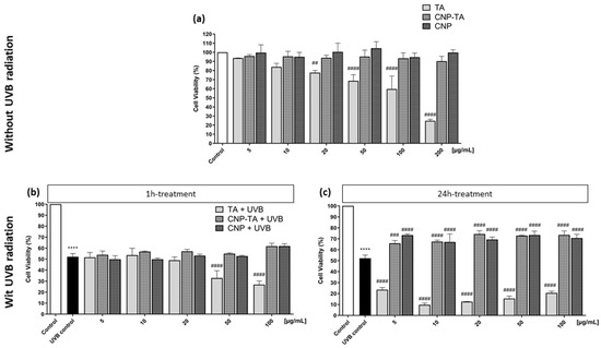 Figure 3. (a) Cytotoxicity effect evaluation of L-929 fibroblasts 24 h treated with TA, CNP-TA and CNPs, without UVB exposure. Control: untreated cells. ## p < 0.01 and #### p < 0.0001 compared to the control. (b,c) Effect of TA, CNP-TA and CNPs on cell viability in L-929 fibroblasts treated (5, 10, 20, 50 and 100 µg/mL) and exposed to UVB radiation. (b) Cells were treated for 1 h, irradiated and incubated for 24 h; (c) Cells were treated for 24 h, irradiated and incubated for an additional 24 h. Control: non-irradiated and untreated cells; UVB control: irradiated and untreated cells. **** p < 0.0001, compared to control, ### p < 0.001 and #### p < 0.0001 compared to UVB control.