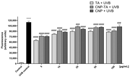 Figure 4. Evaluation of TA, CNP-TA and CNP treatments in the inhibition of reactive oxygen species (ROS) generation in L-929 fibroblasts. After 24 h treatment (5, 10, 20, 50 and 100 µg/mL), cells were exposed to UVB, and ROS were detected immediately after irradiation. **** p < 0.0001 compared to the control, ### p < 0.001 and #### p < 0.0001 compared to the UVB control. Control: non-irradiated and untreated cells; UVB control: irradiated and untreated cells.