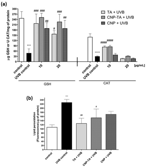 Figure 5. (a) Effect of TA, CNP-TA and CNPs on the restoration of reduced glutathione (GSH) and catalase enzyme (CAT) in L-929 fibroblasts treated (10 and 20 µg/mL) and irradiated with UVB. (b) Effect of TA, CNP-TA and CNPs against lipid peroxidation in L-929 fibroblasts treated (10 µg/mL) and irradiated with UVB. After 24 h of incubation, lipid peroxidation was measured using the DPPP marker. Control: non-irradiated and untreated cells; UVB control: irradiated and untreated cells. *** p < 0.001 and **** p < 0.0001 compared to the control, # p < 0.05, ## p < 0.01, ### p < 0.001 and #### p < 0.0001 compared to UVB control.
