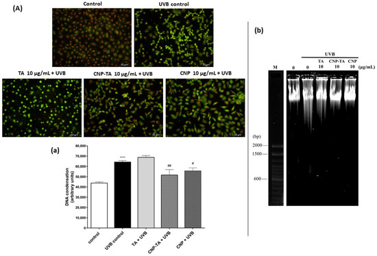 The evaluation of oxidative damage to DNA was evaluated according to its condensation and fragmentation intensity. To assess DNA condensation, cells were stained with acridine orange. Under this dye, the presence of bright green fluorescent spots indicates chromatin condensation. Figure 6A shows representative photomicrographs of three independent experiments and Figure 6a indicates the quantification of DNA condensation by ImageJ software version 1.51. The irradiated-only cells exhibited intense chromatin condensation, due to the intense green fluorescence of the cell nucleus (46.3% increase), in contrast to the non-irradiated cells, which did not exhibit intense green nuclear staining. Treatment with free TA, at a concentration of 10 µg/mL, was not able to reduce the extent of DNA condensation, but treatment with CNP-TA, at the same concentration, was able to reduce DNA condensation, with a reduction in green markings (19.4% reduction) compared to UVB control.