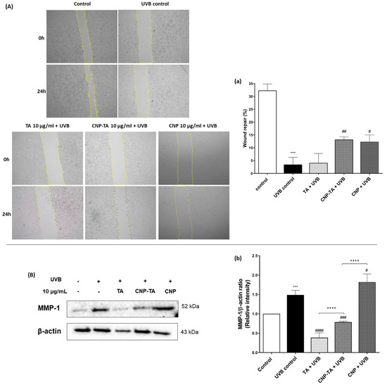 Figure 7. Effect of TA, CNP-TA and CNPs on photoaging prevention. (A;a) Effect of sample on wound repopulation in treated (10 µg/mL) and UVB-irradiated cells. (A) Cells were photographed by light microscopy (5× magnification). The images are representative of three independent experiments: (a) the wound (scratch) area was measured at 0 and 24 h using ImageJ software version 1.51. (B;b) Effect of samples on metalloproteinase-1 (MMP-1) protein expression in treated (10 µg/mL) and UVB-irradiated cells. Protein levels were normalized with β-actin. (B) Protein bands were recorded using ChemiDoc® XRS+ Imaging System; (b) Band quantification was measured using ChemiDoc® software version 2.0 (Bio-Rad, Hercules, CA, USA). Control: non-irradiated and untreated cells; UVB control: irradiated and untreated cells. *** p < 0.001 compared to the control, # p < 0.05, ## p < 0.01, ### p < 0.001 and #### p < 0.0001 compared to the UVB control, ++++ p < 0.0001.