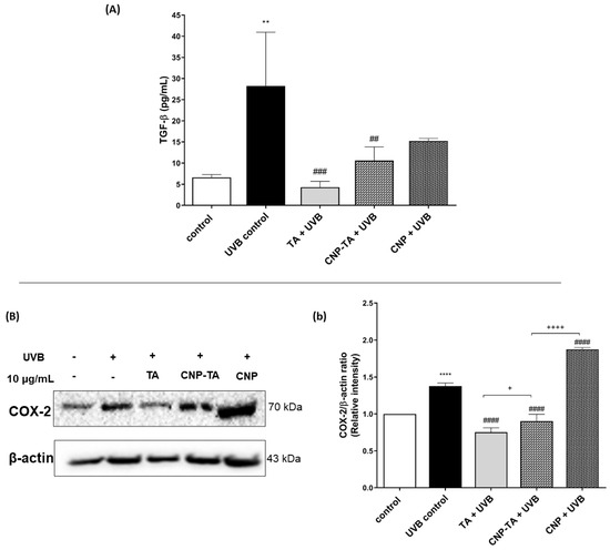 Figure 8. Effect of TA, CNP-TA and CNPs on the prevention of UVB-induced inflammation. (A) Effect of samples on the inhibition of transforming growth factor beta (TGF-β) in treated (10 µg/mL) and UVB-irradiated cells. (B;b)Effect of samples on cycloxygenase-2 (COX-2) protein expression in treated (10 µg/mL) and UVB-irradiated cells. Protein levels were normalized with β-actin. (B) Protein bands were recorded using ChemiDoc® XRS+ Imaging System; (b) Band quantification was measured using ChemiDoc® software version 2.0. Control: non-irradiated and untreated cells; UVB control: irradiated and untreated cells. ** p < 0.01, **** p < 0.0001 compared to control, ## p < 0.01, ### p < 0.001 and #### p < 0.0001 compared to UVB control, + p < 0.05 and ++++ p < 0.0001.