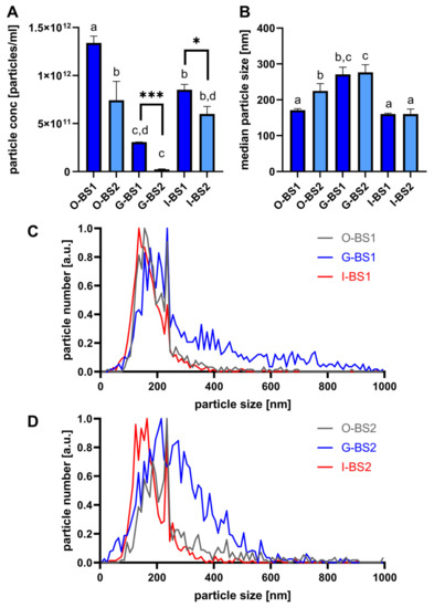 Another explanation for the difference in lipid hydrolysis might be based on the oil droplet size within the oil-in-water-emulsion that is formed during digestion. When the oil droplets are smaller, the total surface area available for the adsorption of lipase becomes larger; therefore, enzymatic digestion becomes faster [15]. Since the capsule material could influence the oil droplet size or emulsion stability during digestion [15], this could affect lipid hydrolysis. To test this hypothesis, digestates of black seed oil encapsulated in starch and gelatin after oral (O-BS1 and O-BS2), gastric (G-BS1 and G-BS2), and intestinal (I-BS1 and I-BS2) in vitro digestion were analyzed using nanoparticle-tracking analysis. The concentration and size distribution of particles, including the oil droplets, in the size range of about 50 to 1000 nm were assessed.