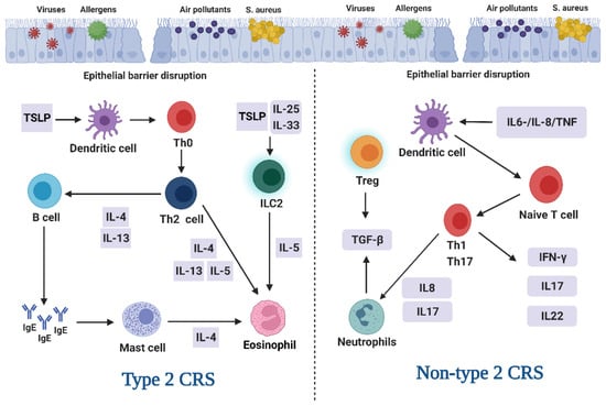 CRS can be classified into type 2 and non-type 2 CRS, based on the differences in immune responses between Th1/Th17 and Th2 cells [58]. Previous studies have concluded that CRS without nasal polyps (CRSsNP) shows neutrophilic predominance, whereas CRSwNP exhibits eosinophilic predominance [59]. However, contrary to these findings for European and American patients, most Asian patients with CRSwNP possessed neutrophil predominance, and CRSsNP showed an immune response favoring type 2 CRS and type 1 or 3 inflammation [60]. As illustrated in Figure 1, type 2 CRS is characterized by epithelial cell disorder and elevated levels of Th2 cells (which produce interleukin (IL)-4, IL-5, and IL-13 cytokines), B cells, dendritic cells, and eosinophils [61,62]. The nasal sinus epithelium is the main source of thymic stromal lymphopoietin, which plays a key role in type 2 inflammation by activating Th2 cells and group 2 innate lymphoid cells [63]. IL-5 promotes eosinophil inflammation, whereas IL-4 and IL-13 activate homotypic transformation and mucus production in CRSwNP [61]; B cells produce IgE and other immunoglobulins [62]. It has also been reported that the levels of type 2 inflammatory cytokines IL-25 and IL-33 originating from other epithelial sources are increased in type 2 CRS [64]. Unlike type 2 CRS, non-type 2 CRS is associated with a significant increase in Th1/Th17 cells, corresponding with elevated levels of interferon (IFN)-γ, IL-8, and IL-17 cytokines [65]. IL-6, IL-8, and tumor necrosis factor stimulate the production of IFN- γ and further IL-8 by T cells to strengthen the immune response; IL-8 recruits neutrophils into this region, which release more cytokines, and the epithelial response to environmental stimuli leads to the activation of dendritic cells, thereby inducing the differentiation of Th1 and Th17 cells [66]. According to its phenotype, CRS is currently classified as either expressing or lacking nasal polyps (NPs) [67]. Of the two, CRSwNP is usually accompanied by a dysfunction of the nasal mucosal fibers responsible for mucus transportation and self-cleaning, which leads to the inability of ciliated cells to lubricate the epithelium and remove impurities [68]. This change in the innate defense mechanism of the upper respiratory tract relates to the etiology of CRSwNP, with the antibacterial and antioxidant capacity of the tract showing a gradual decline as CRSwNP progresses [69]. Along with the decline in antioxidant capacity, oxidative stress plays a crucial role in the pathogenesis of CRSwNP [70,71].