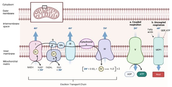 Once stimulated, NST can proceed through multiple mechanisms. Since the 1970s, it has been demonstrated that UCP1 is the dominant protein responsible for thermogenesis induced during cold exposure []. Therefore, the main mechanisms of NST are broadly classified as either UCP1-dependent or UCP1-independent. In contrast to ATP production during coupled respiration, UCP1 allows for the futile cycling of protons and backflow across the inner mitochondrial membrane. Consequently, oxidation becomes separated from the oxidative phosphorylation necessary for energy production in a phenomenon termed “uncoupled respiration.” As a result, the proton gradient across the inner mitochondrial membrane of thermogenic fat is decreased, which can be inhibited by purine nucleotides such as GDP and ATP []. The resulting loss of protonic backpressure leads to NADH and FADH2 generation at an enhanced rate []. Although respiration is accelerated in this case, the energy of the respiratory chain is released as heat rather than being directed towards ATP production (Figure 1b) []. Thus, uncoupled respiration during NST is capable of expending substantial amounts of energy.