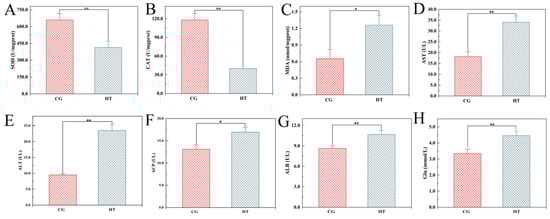 After thermal stress, the activities of SOD and CAT were significantly lower in the HT group than in the CG group (Figure 1A,B). Conversely, the MDA contents, AST, ALT, ACP, and ALB activities, and Glu levels were significantly higher in the HT group than in the CG group (Figure 1C–H).