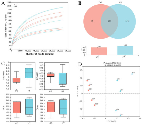 A total of 337,024 effective sequences were obtained from 10 samples with an average length of 427 bp per sample. The rarefaction curve tended to reach a plateau (Figure 2A), which indicates that there was adequate sequencing depth in all the samples, and the data can thus be used for subsequent analysis in this study. A total of 219 shared OTUs were detected in the two groups, and the number of unique OTUs for the CG and HT groups was 86 and 136, respectively (Figure 2B). Compared with the CG group, the Shannon index value of the HT group increased, while the values of the Simpson, Ace, and Chao indices decreased, but these differences were not statistically significant (p > 0.05) (Figure 2C). The PCoA analysis based on Bray–Curtis showed that the intestinal bacteria in the CG and HT groups were clearly separated (Figure 2D).