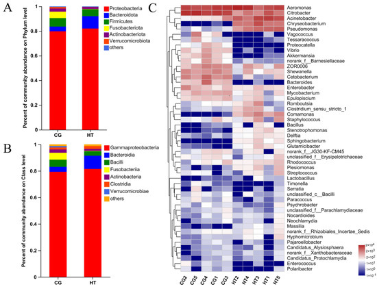 The taxa of dominant bacteria among the two groups were similar, while their abundance was altered. At the phylum level, the relative abundance of Proteobacteria and Bacteroidota increased in the HT group compared with the CG group, while the abundance of Firmicutes, Fusobacteriota, and Actinobacteriota species decreased (Figure 3A). At the class level, the relative abundance of Gammaproteobacteria, Bacteroidia, and Clostridia increased, while the abundance of Bacilli, Fusobacteriia, and Verrucomicrobiae decreased (Figure 3B). At the genus level, certain genera, such as Acinetobacter, Chryseobacterium, and Pseudomonas, increased in the HT group, while Citrobacter, Cetobacterium, and Bacteroides decreased (Figure 3C).