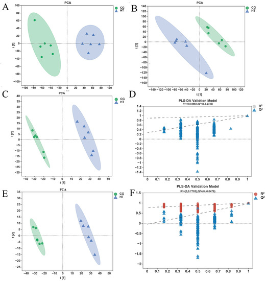 Quality analysis of metabolomics data. The PCA score plot of samples acquired in (A) positive ion and (B) negative ion mode. The OPLS-DA (C) score plot and (D) permutation test for positive ion mode. The OPLS-DA (E) score plot and (F) permutation test for negative ion mode.