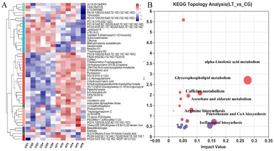 To explore the potential metabolic pathways affected by thermal stress, the KEGG annotations of all DEMs were further analyzed. Compared with CG, the most enriched pathways in the HT group based on the DEMs were alpha-linolenic acid metabolism, pantothenate and CoA biosynthesis, isoflavonoid biosynthesis, glycerophospholipid metabolism, ascorbate and aldarate metabolism, caffeine metabolism, and arginine biosynthesis (Figure 5B).