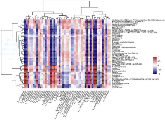 Significant correlations between intestinal bacteria at the genus level and DEMs. The correlation coefficient is represented by different colors (red, positive correlation; blue, negative correlation) with the intensity reflecting the strength as indicated in the scale. * represents significantly negative or positive correlation (* p < 0.05; ** p < 0.01; *** p < 0.001).