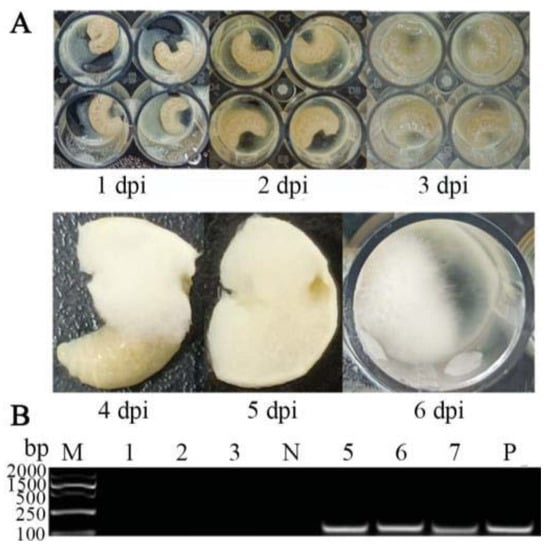 Observation and verification of A. apis infection of A. cerana larvae. (A) Observation of larval chalkbrood symptom after A. apis spore inoculation; (B) PCR validation of larval guts inoculated with A. apis spores. Lane M: DNA marker; Lane 1–3: uninoculated 6-, 5-, and 4-day-old larval guts; Lane N: sterile water (negative control); Lane 5–7: A. apis–inoculated 6-, 5-, and 4-day-old larval guts; Lane P: purified spores of A. apis (positive control).