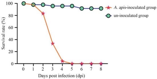 It was detected that the survival rate of A. cerana larvae in the A. apis–inoculated group was 97.92%, 83.33%, and 33.33% at 1 dpi–3 dpi, respectively; additionally, the larval survival rate sharply decreased to 4.16% at 4 dpi and to 0 at 5 dpi (shown in Figure 2). Comparatively, the survival rate of larvae in the uninoculated group was always high at 1 dpi–8 dpi, with an average survival rate of 95.37%, as shown in Figure 2.
